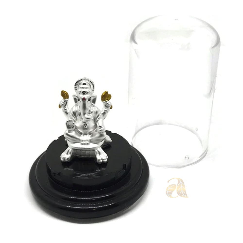 999 Pure Silver LORD GANESHA Silver idol is made of 99.9% pure silver and comes with cherry colored round wood stand and hard acrylic removable cover. Reference Idols were first crafted in clay by Skilled and Reputed Sculptors and then converted into Silver Form, conforms to Vastu and Indian religious traditions. Made with Excellent Silver hardness and superior quality.
