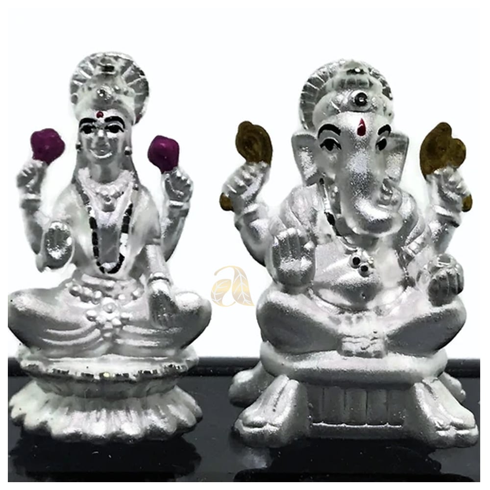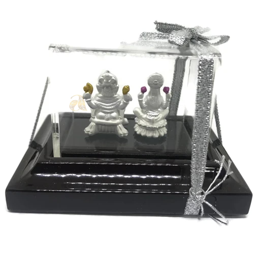 999 Pure Silver LORD GANESHA & GODDESS LAKSHMI / LAXMI SILVER IDOL Silver idol is made of 99.9% pure silver and comes with cherry colored Rectangular wood stand and hard acrylic Removable Rectangular cover. Reference Idols were first crafted in clay by Skilled and Reputed Sculptors and then converted into Silver Form, conforms to Vastu and Indian religious traditions. Made with Excellent Silver hardness and superior quality.