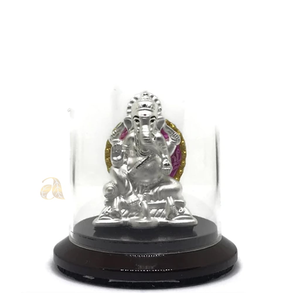 999 Pure Silver LORD GANESHA Silver idol is made of 99.9% pure silver and comes with cherry colored round wood stand and hard acrylic removable cover. Reference Idols were first crafted in clay by Skilled and Reputed Sculptors and then converted into Silver Form, conforms to Vastu and Indian religious traditions. Made with Excellent Silver hardness and superior quality.