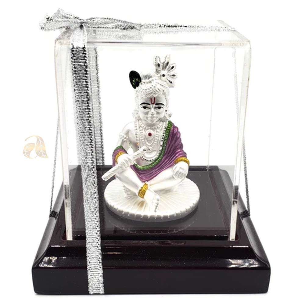999 Pure Silver Krishna / LORD Krishna / Bal Gopal Silver idol is made of 99.9% pure silver and comes with cherry colored Square wood stand and hard acrylic Removable Square cover. Reference Idols were first crafted in clay by Skilled and Reputed Sculptors and then converted into Silver Form, conforms to Vastu and Indian religious traditions. Made with Excellent Silver hardness and superior quality..