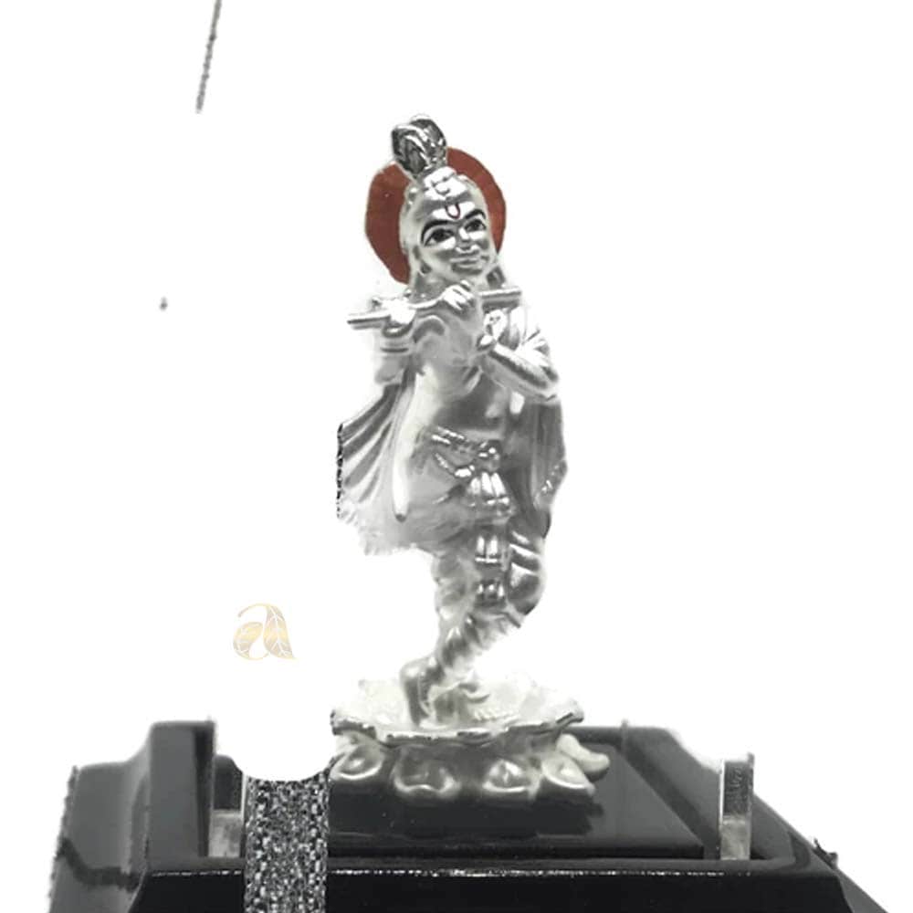 999 Pure Silver Krishna / LORD Krishna Silver idol is made of 99.9% pure silver and comes with cherry colored Square wood stand and hard acrylic Removable Square cover. Reference Idols were first crafted in clay by Skilled and Reputed Sculptors and then converted into Silver Form, conforms to Vastu and Indian religious traditions. Made with Excellent Silver hardness and superior quality.