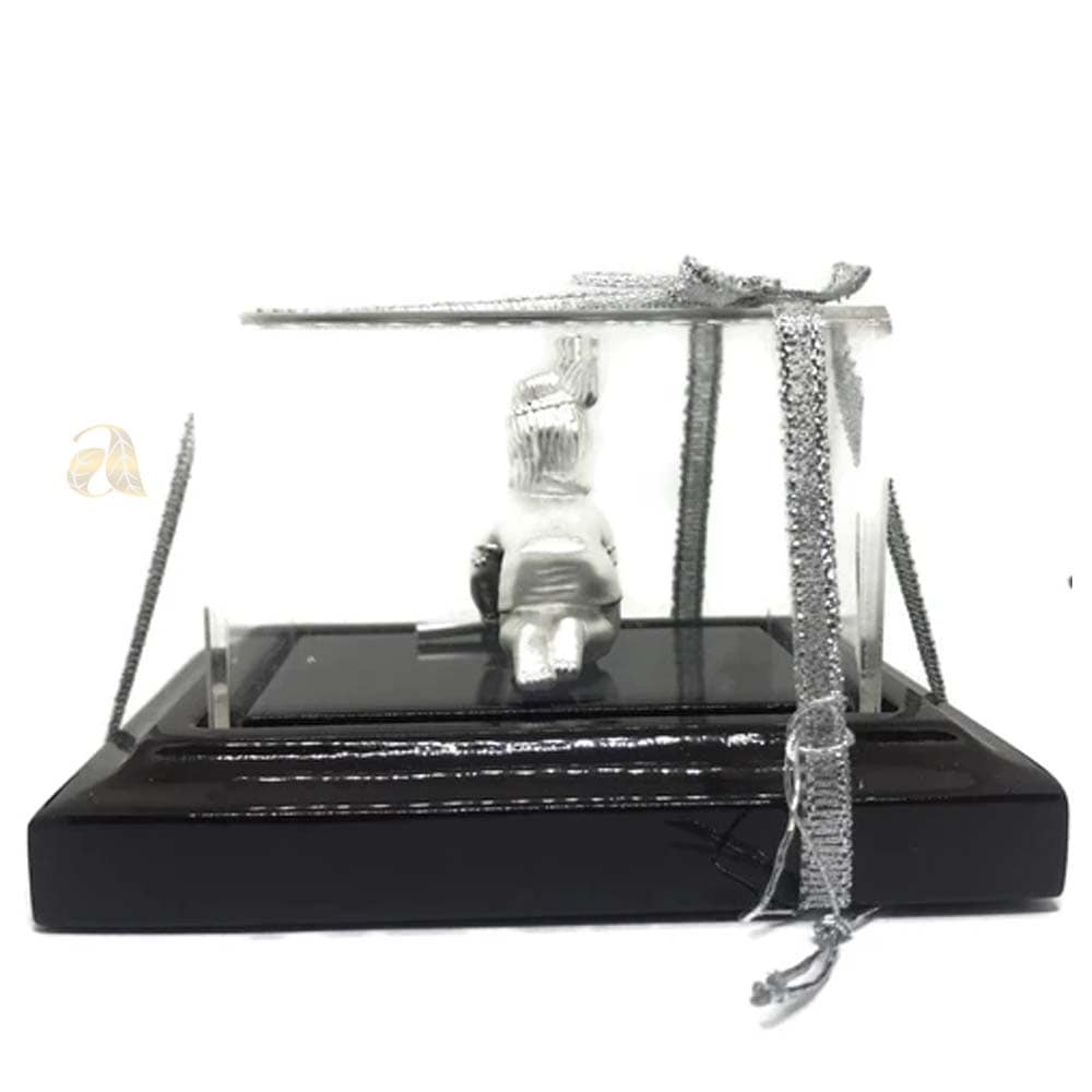 999 Pure Silver Krishna / LORD Krishna Silver idol is made of 99.9% pure silver and comes with cherry colored Rectangular wood stand and hard acrylic Removable Rectangular cover. Reference Idols were first crafted in clay by Skilled and Reputed Sculptors and then converted into Silver Form, conforms to Vastu and Indian religious traditions. Made with Excellent Silver hardness and superior quality..