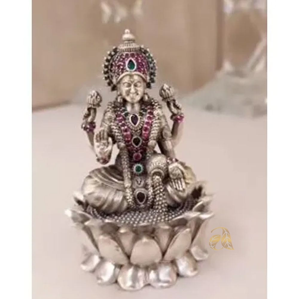 Goddess of Wealth, Dhana Lakshmi crafted using Silver in Antique Nakshi workmanship with Uncut Rubies aggrandize the pooja Mandir.