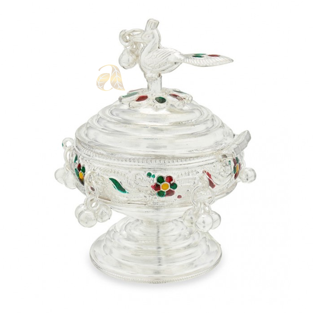 Beautifully designed silver kumkum chimil. The hanging balls add a charm to the kumkum chimil.