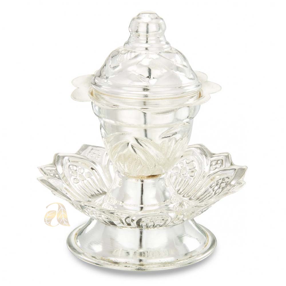 Beautifully designed silver kumkum chimil is placed on the lotus.