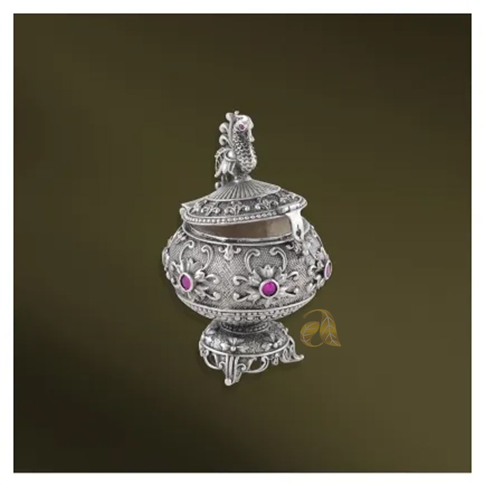 Meaningful and extremely visually appealing, these 92.5Purity Silver Peacock Kumkum Bharani features oxidized finish and colored stones for a touch a Pink hue.
