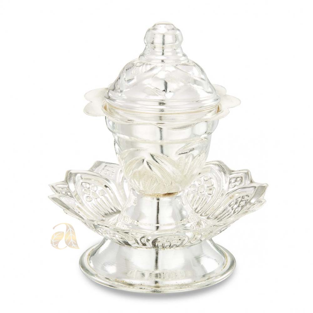 Beautifully designed silver kumkum chimil is placed on the lotus.